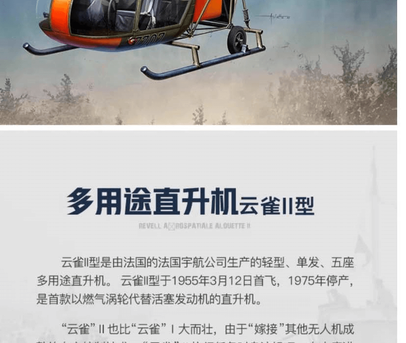 The Alouette II is a lightweight, single-engine, five-seat multi-purpose helicopter produced by the French company Aérospatiale. The Alouette I first flew on March 12, 1955, and production ceased in 1975. It was the first helicopter to use a gas turbine instead of a piston engine.